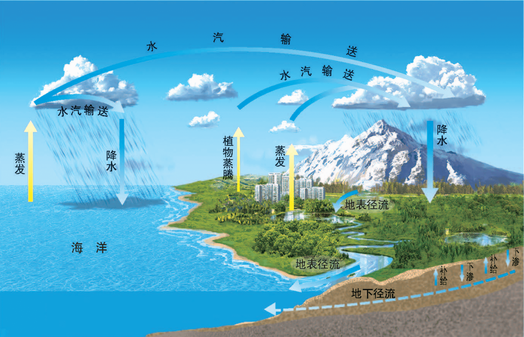- “纽带”:把各个圈层联系起来,把各种水体相互转化,称为一个连续统一的动态系统。