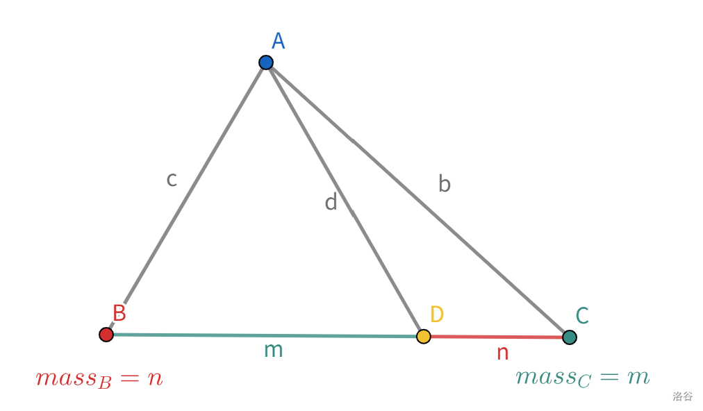 在点 $B$ 处放一个质量为 $n$ 的质点,在点 $C$ 处放一个质量为 $m$ 的质点。可以发现这个质点系的质心在 $D$。
