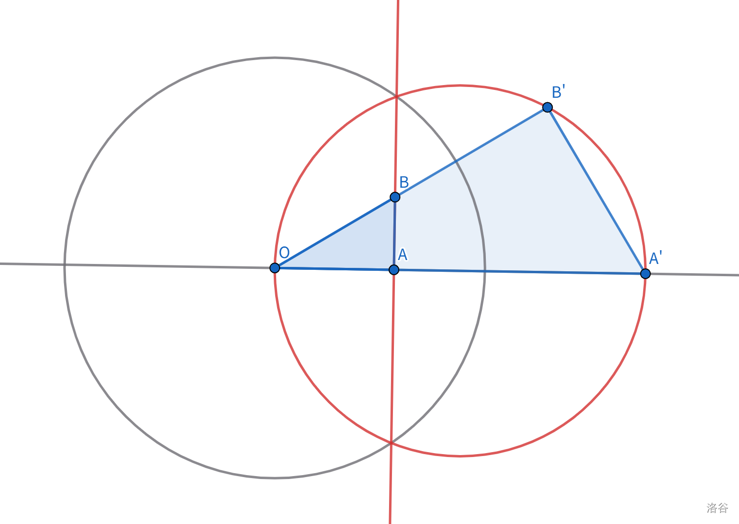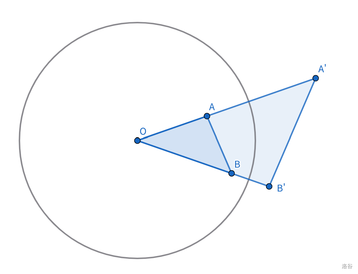 构造刚才的相似三角形,可知 $\angle OB’A’ = \angle OAB$ 是直角。因此 $B’$ 在以 $OA’$ 为直径的圆 $\omega$ 上。